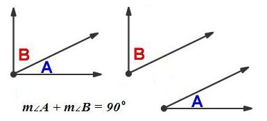 Complementary angles are two acute angles that add to 90°.
